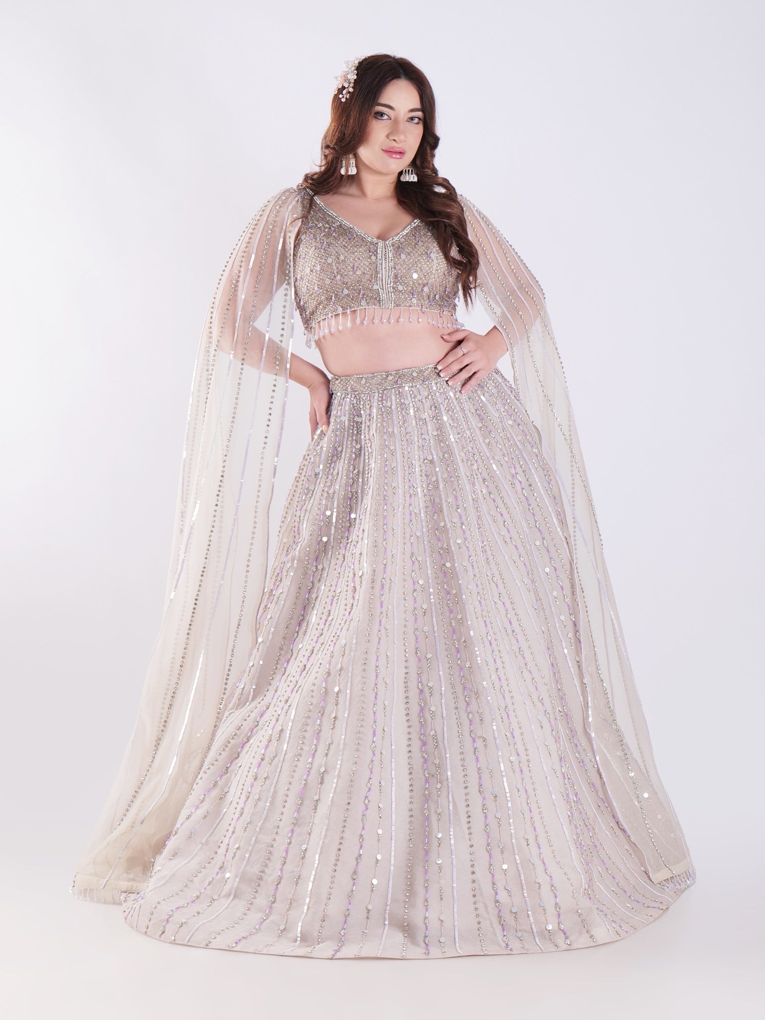 Ivory Sequin Lehenga Set with Sheer Cape Sleeves